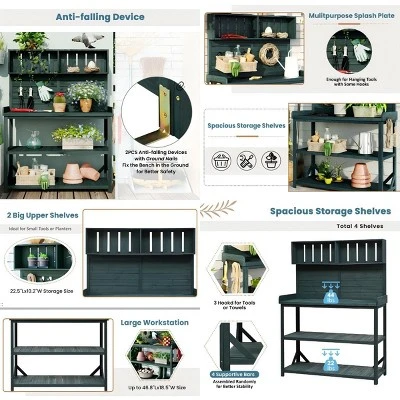 Transform your gardening experience and elevate your outdoor space with The Pop Home Wooden Potting Bench, a versatile and stylish addition to your patio or garden. Crafted from 100% durable fir wood, this garden workstation offers both functionality and charm, making it the perfect companion for any gardening enthusiast. With a spacious 46.8″ x 18.5″ tabletop, this potting bench provides ample space to organize your tools, pots, and plants, while its farmhouse design inspires creativity for the upcoming gardening season.Designed with practicality in mind, this potting bench features 4 ample storage shelves, offering a total height of 65″ and a convenient potting height of 36″. The upper shelf, including two grid sections, and three lower shelves are perfect for storing gardening essentials such as soil, pots, tools, and decorations. Whether you’re organizing small tools or showcasing vibrant flowers, this bench keeps everything within reach, so you can enjoy gardening without the need to bend or squat.To make your gardening experience even easier, the bench is equipped with a splash plate and side hooks. The splash plate doubles as a tool-holding board, allowing you to hang items like trowels, rakes, towels, or even your favorite gardening hat with just a few nails. Additionally, the three side hooks provide extra space to keep smaller tools handy, ensuring everything you need is always organized and accessible.For added safety and stability, this potting bench includes an anti-falling safety device. Designed with ground nails, the bench can be securely anchored to the ground, providing peace of mind when placed on uneven surfaces. Whether on your patio, in your garden, or even indoors, this feature ensures your workstation stays steady and safe.With its forest green finish, this potting bench effortlessly complements any outdoor setting while being sturdy enough to handle the demands of gardening. Its overall size of 46.9″W x 19.3″D x 65″H is perfect for any space, providing a functional yet compact design. The tabletop supports up to 44 lbs, while each shelf can hold up to 22 lbs, making it versatile enough for all your gardening needs. Assembly is simple, with all tools included in the package, so you can start enjoying your new workstation in no time.Bring organization, style, and functionality to your garden with The Pop Home Wooden Potting Bench. Whether you’re storing tools, planting flowers, or displaying your favorite plants, this workbench is designed to support your passion for gardening while adding a touch of charm to your outdoor space.