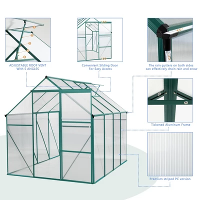 Create the perfect growing conditions with our heavy-duty walk-in greenhouse, designed for durability and functionality. Featuring a 4mm polycarbonate panels that withstand extreme temperatures (-20°C to 70°C) while allowing 70% light transmission and blocking 99.9% of UV rays, this greenhouse ensures your plants thrive year-round. The powder-coated aluminum alloy frame resists rust, and the adjustable roof enhances ventilation while inviting pollinators. A sliding door keeps pests out, and the galvanized base with drainage system prevents water buildup, ensuring stability in all weather. Spacious enough for multiple plants, it’s ideal for avid gardeners seeking a frost-proof, heat-resistant solution.
