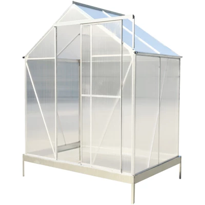 Description:Name: greenhouseColor: Green/SilverCover Material: Polycarbonate (PC)/4mmFrame Material: Aluminum Frame/Steel base with ground anchorFinish: Aluminum Powder coated colorPacking list:1x greenhouse1x accessory bag