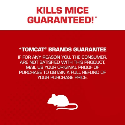 All it takes is one simple set. The Tomcat® Press ‘N Set® Mouse Trap is guaranteed* to kill mice and allows for easy, no-touch disposal. These plastic, spring-loaded snap traps are easy to set and reduce the risk of pinched fingers. To use, place a pencil eraser-sized dollop of food such as peanut butter into the bait well. After baiting, pull the set bar back the entire way until you hear a “click” to tell you it is locked. Mice have a natural tendency to run along walls as they move from hiding to feeding, so we recommend placing traps with the bait well facing the walls of rooms or cupboards where activity is suspected, such as kitchens, utility rooms, or garages (droppings and oily marks along baseboards are a telltale sign of activity). Once the mouse has been killed, pick up the trap using the grab tab and dispose of the trap and the mouse in the trash. Your fingers will never touch the dead mouse! This package of Tomcat® Press ‘N Set® Mouse Trap contains 2 disposable mouse traps. *Tomcat Brands Guarantee: If for any reason you, the consumer, are not satisfied with this product, mail us your original proof of purchase to obtain a full refund of your purchase price.